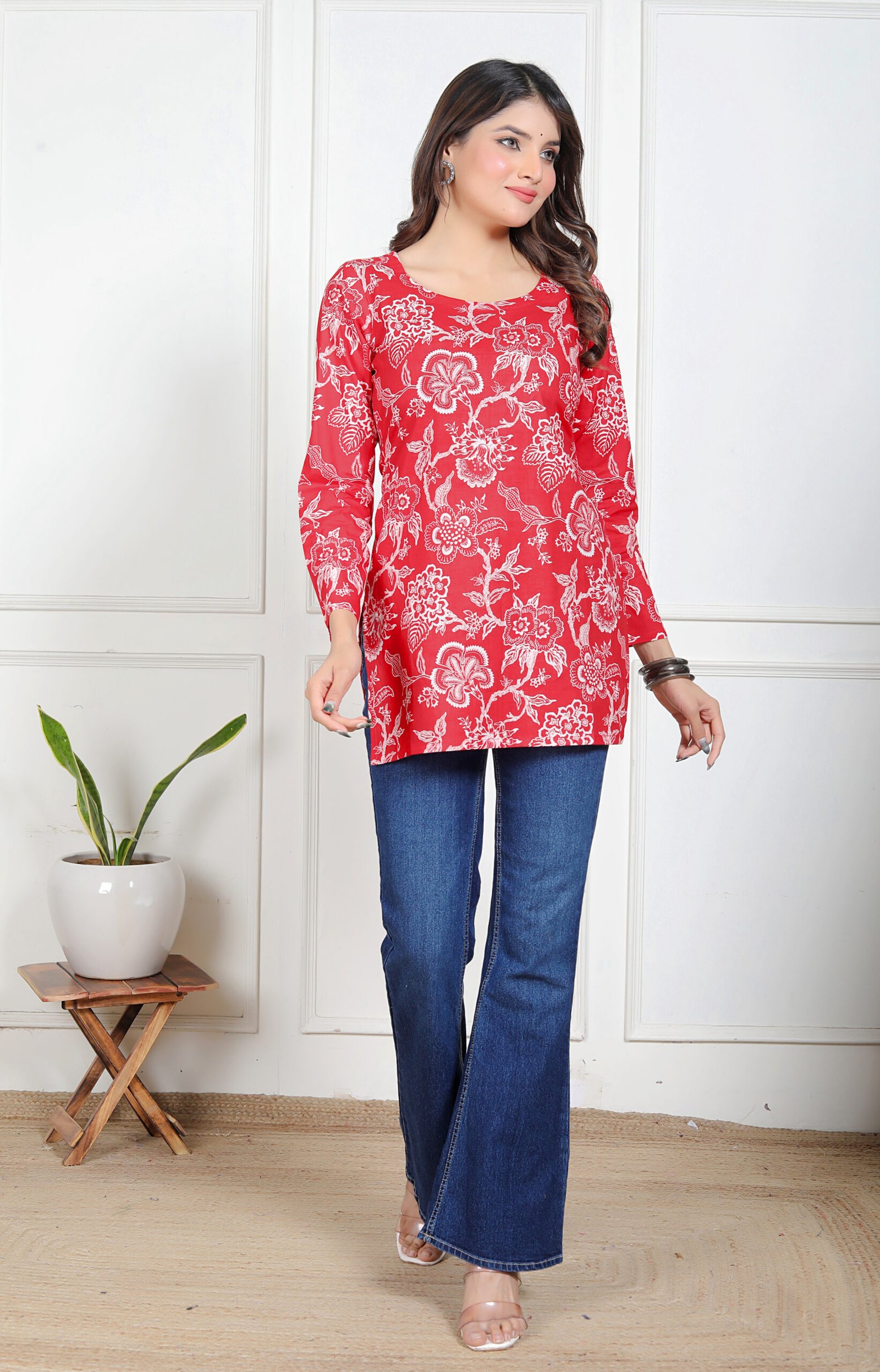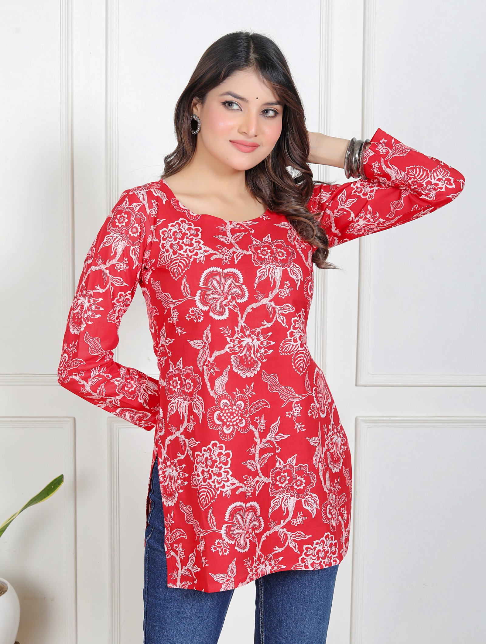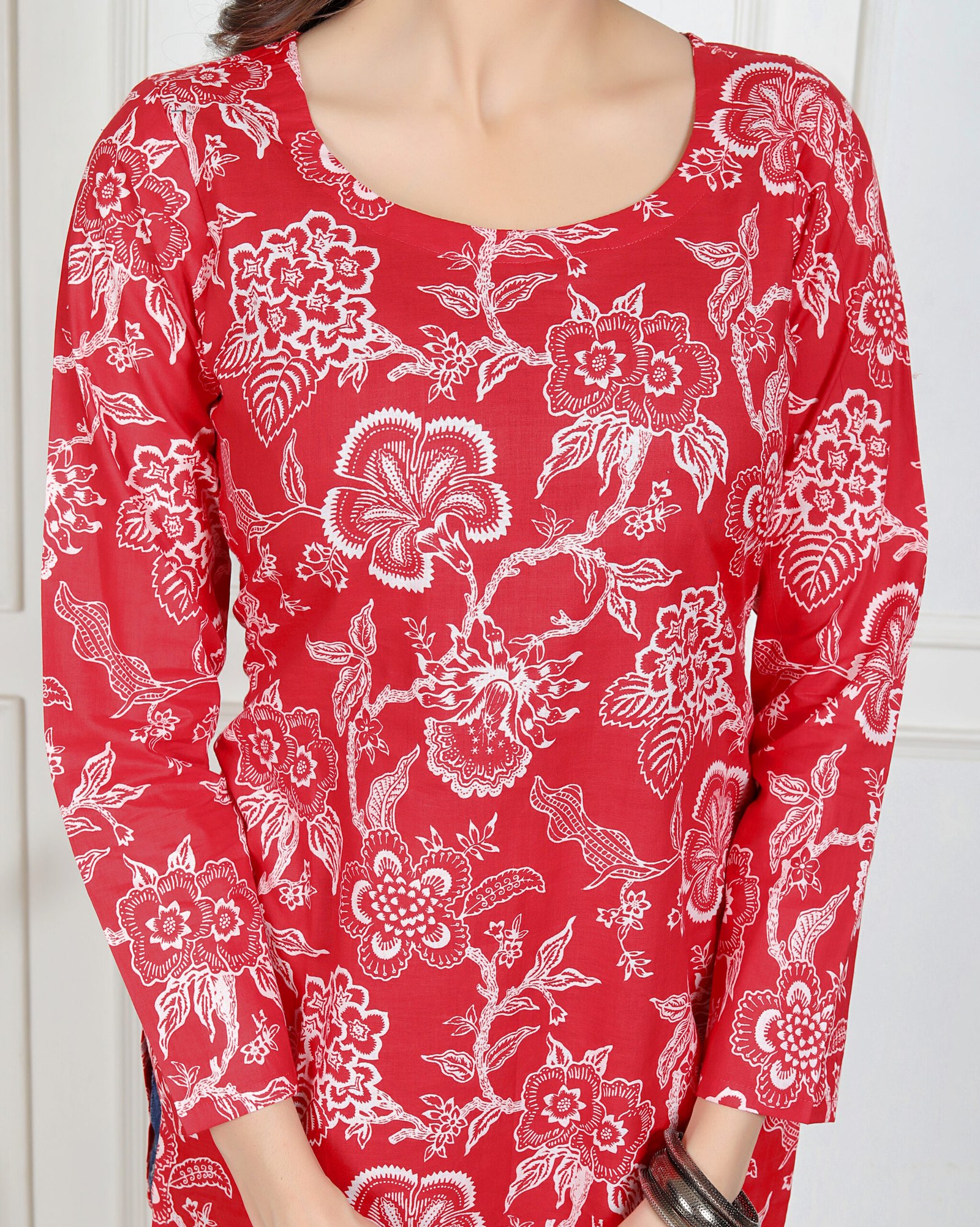 Azeena Charm is designed for women who love making a strong yet graceful impression through their style. Set on a rich red base, the kurti features intricate white floral prints that create a beautiful contrast, giving it a refined and eye-catching appeal without feeling overwhelming.