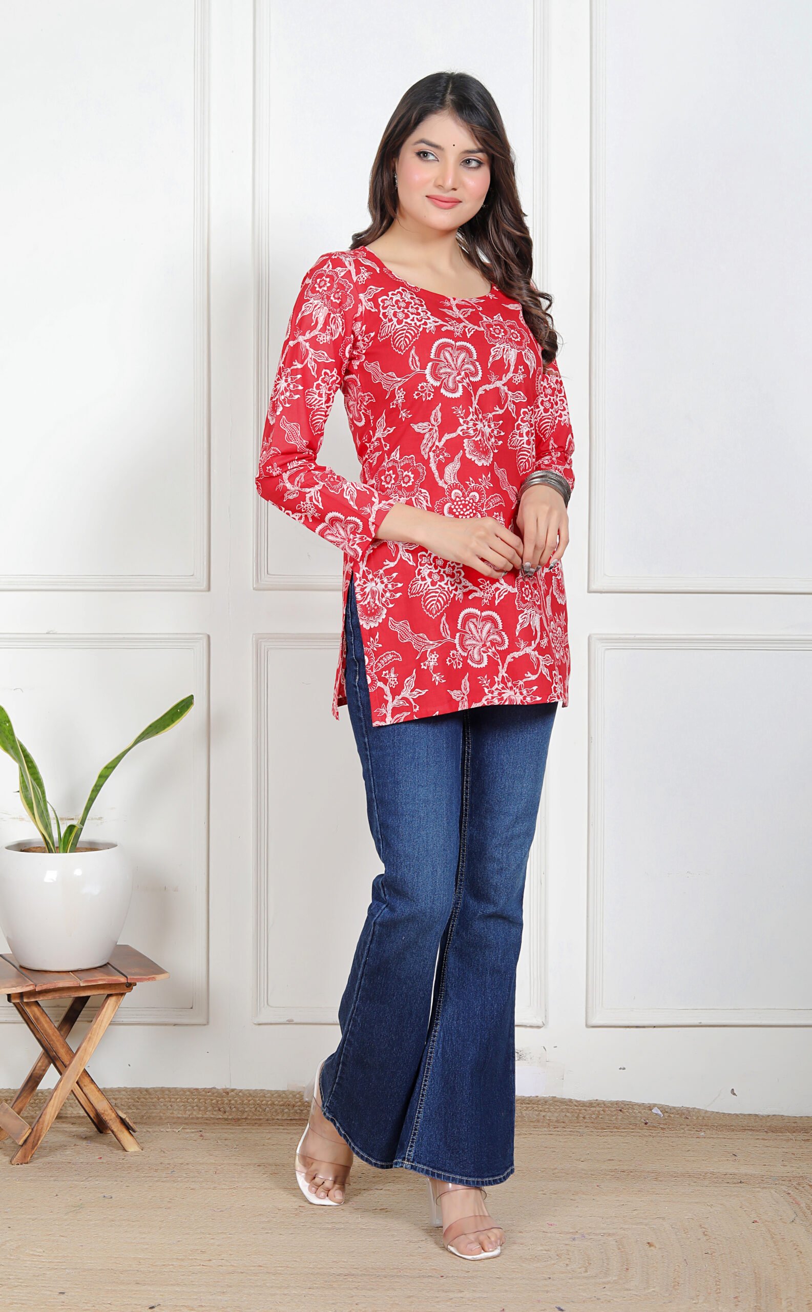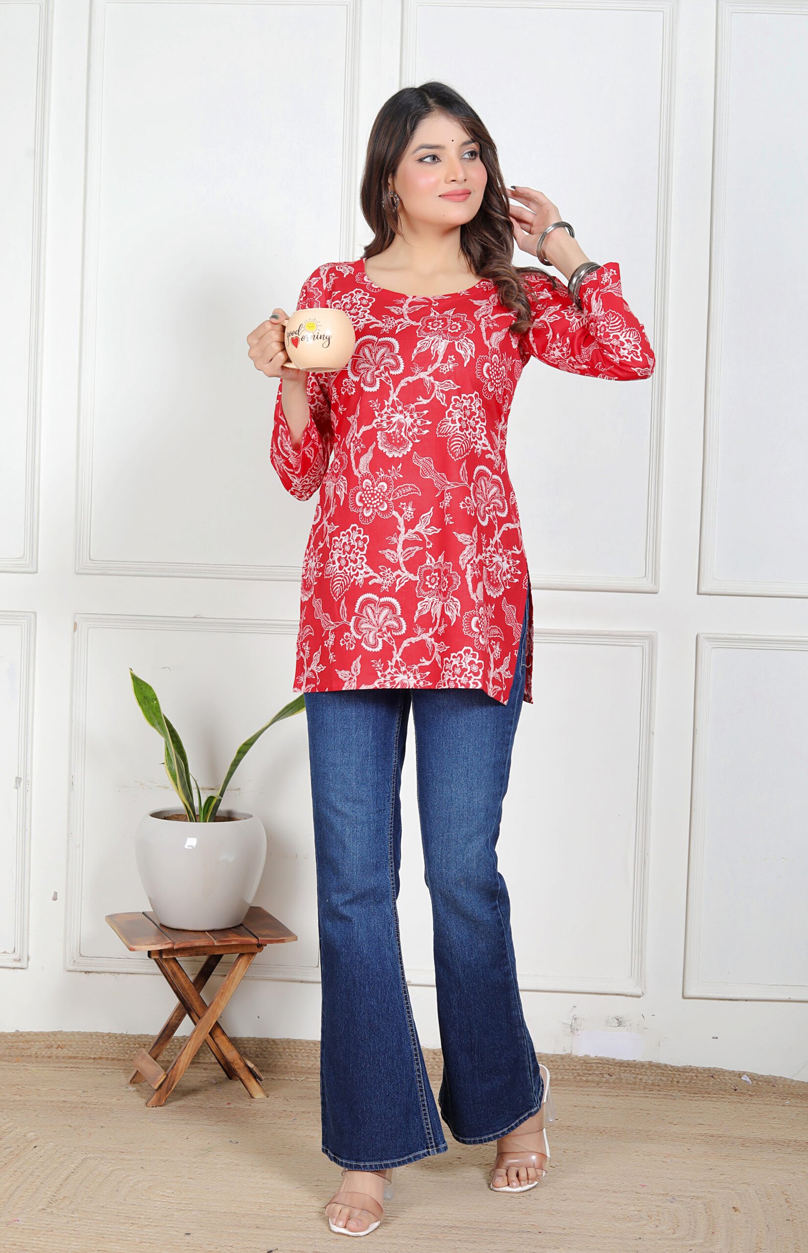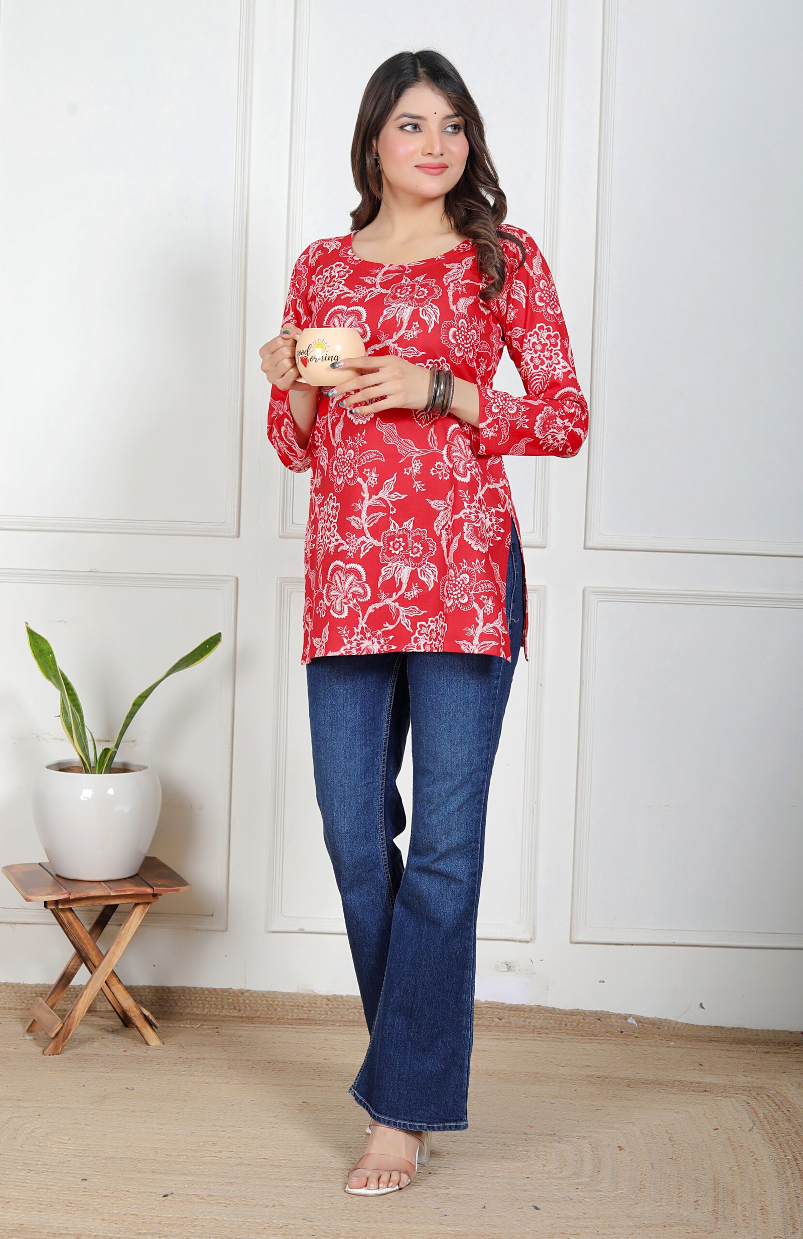 Azeena Charm is designed for women who love making a strong yet graceful impression through their style. Set on a rich red base, the kurti features intricate white floral prints that create a beautiful contrast, giving it a refined and eye-catching appeal without feeling overwhelming.