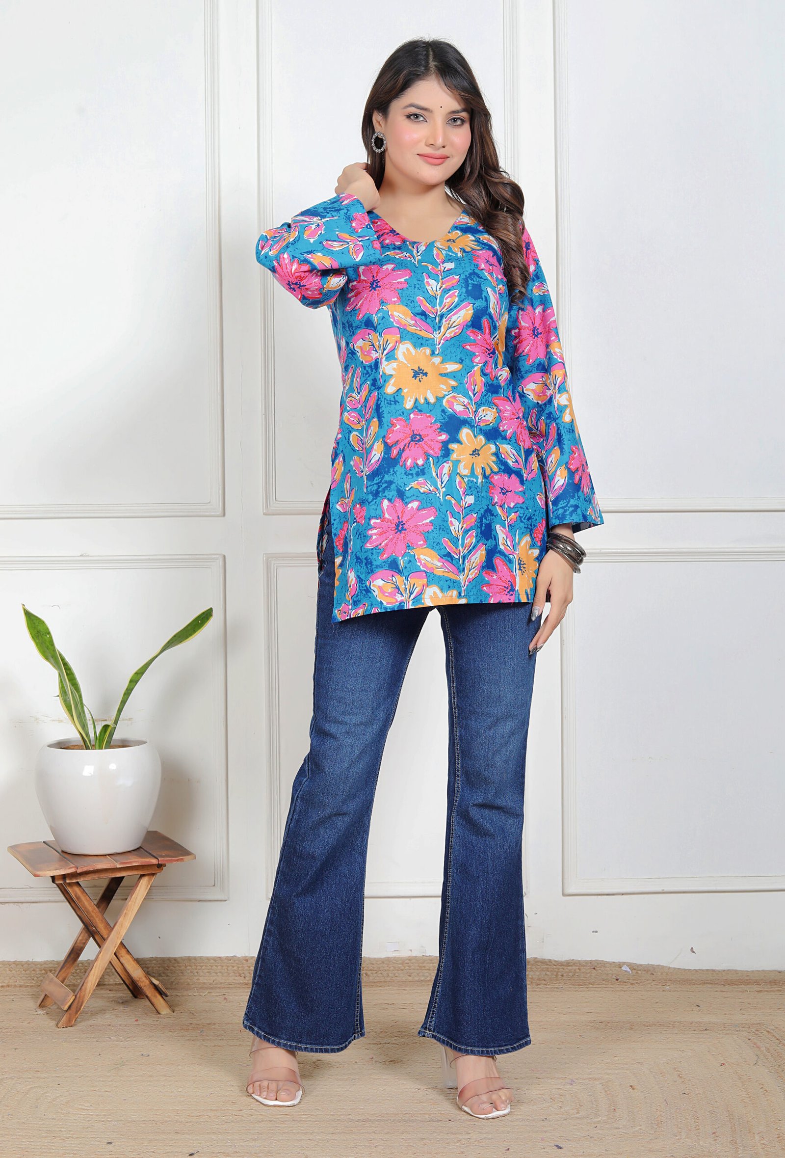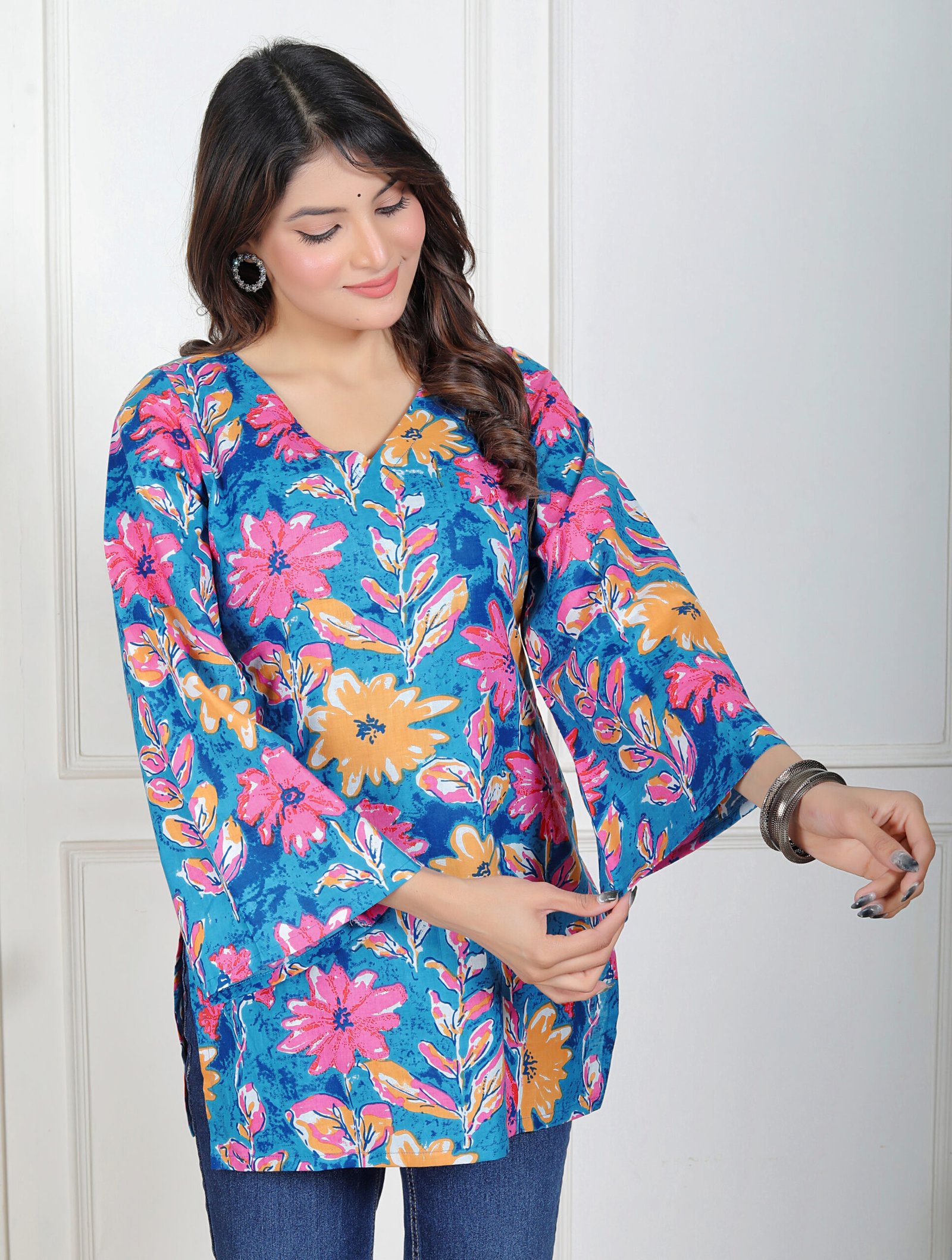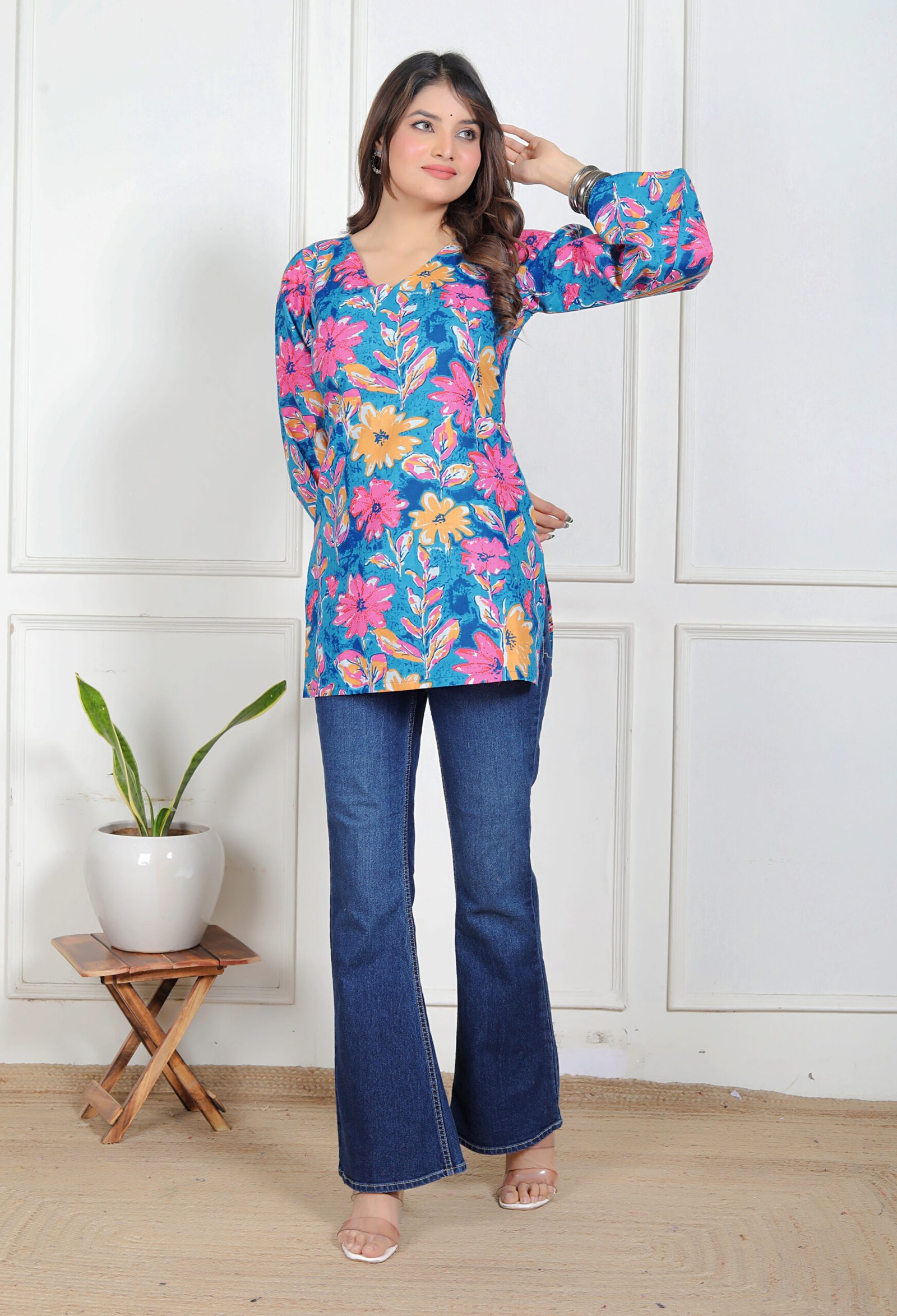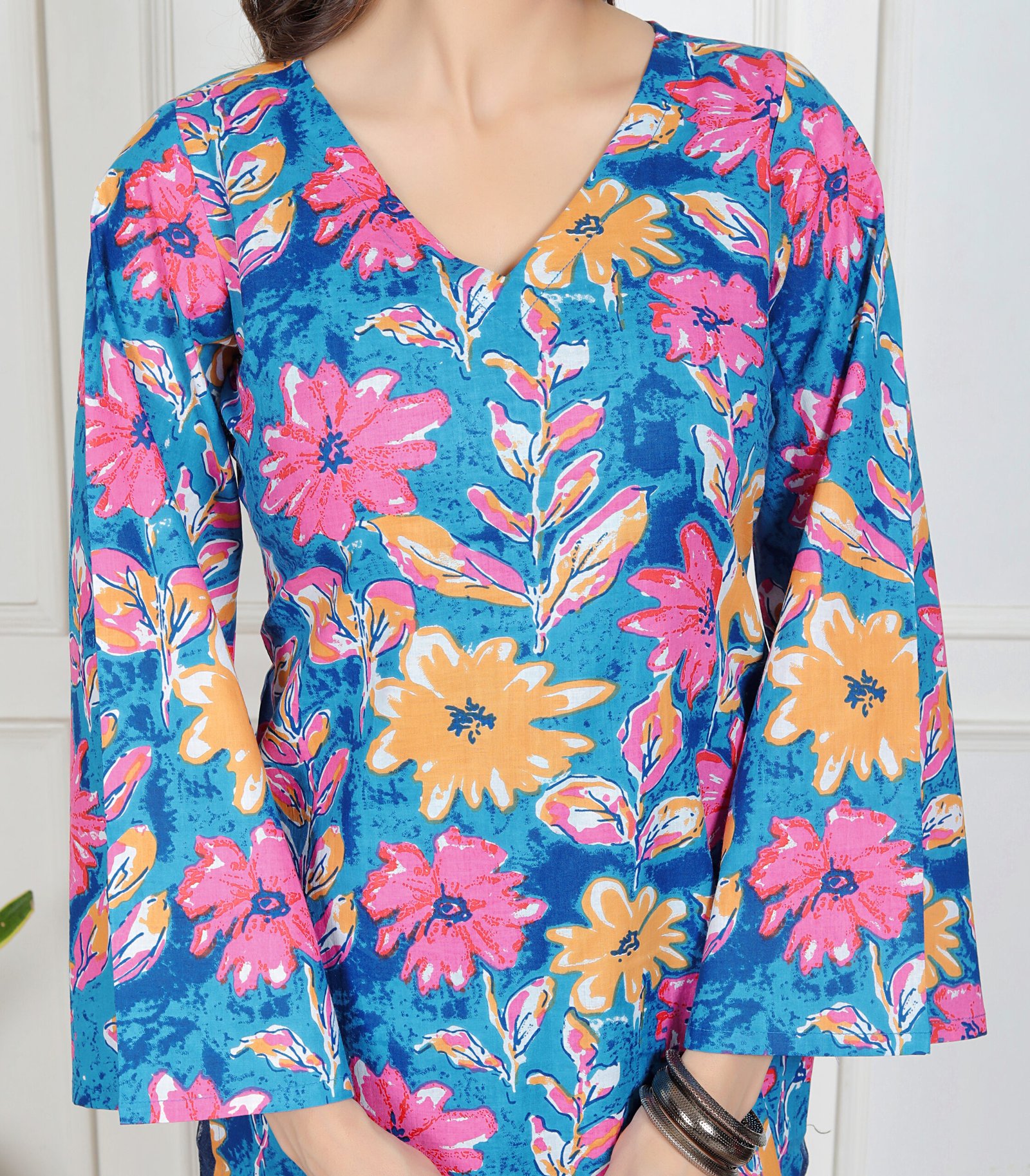 Azeeya Noor is crafted for those who prefer their everyday style with a touch of bold elegance. Set on a rich teal blue base, the kurti features oversized floral prints in vibrant pink and warm mustard tones, creating a striking contrast that naturally draws attention.