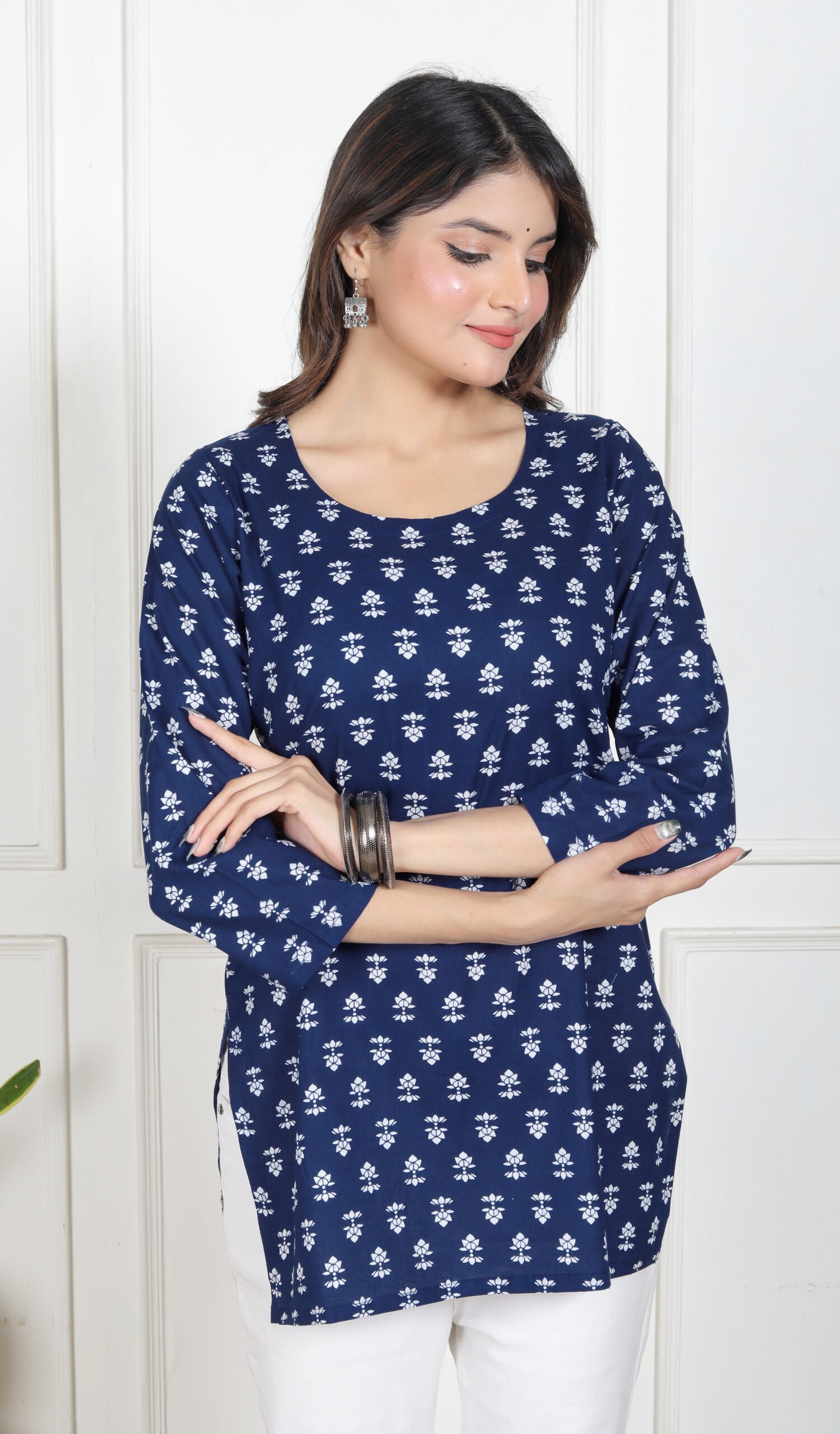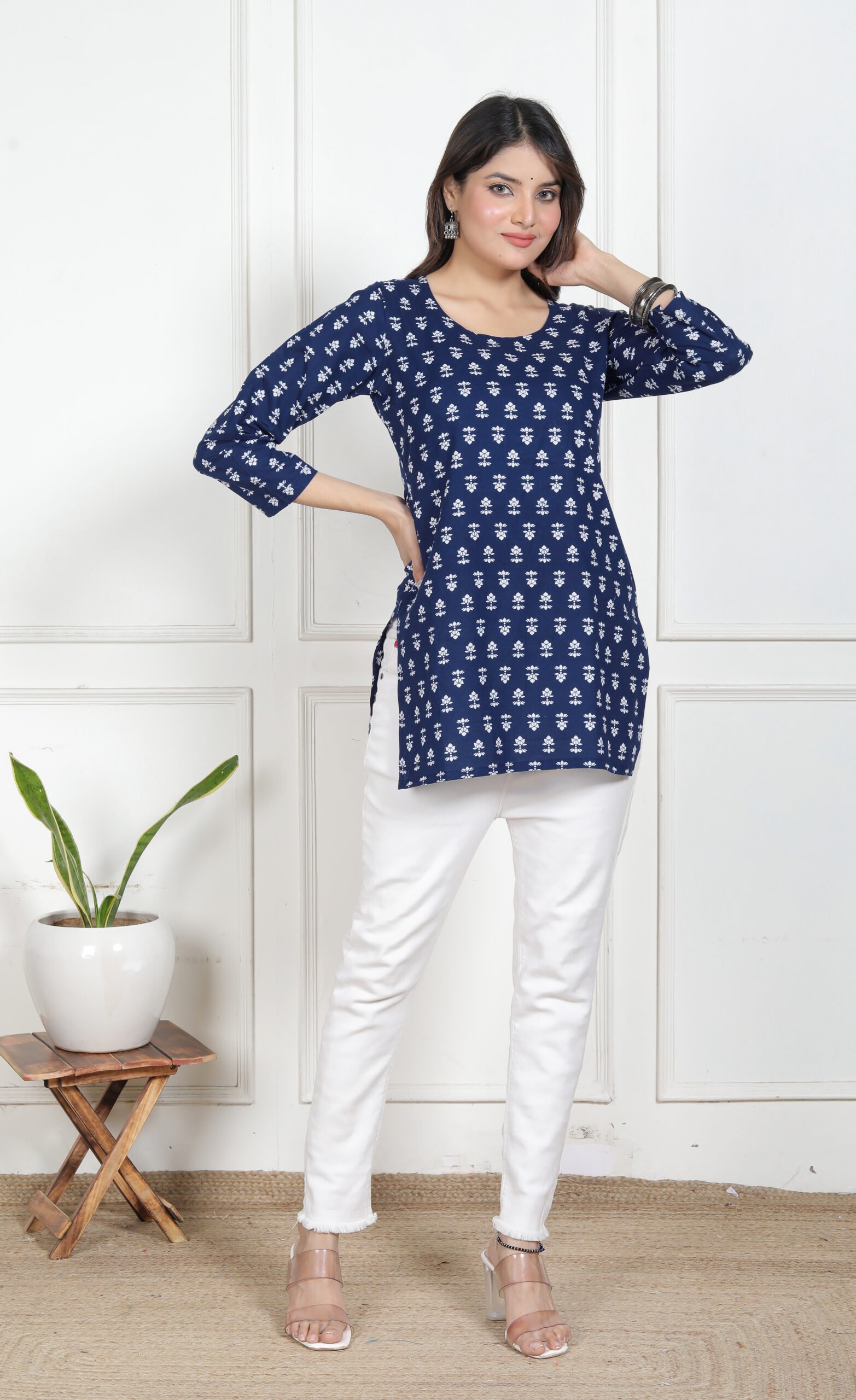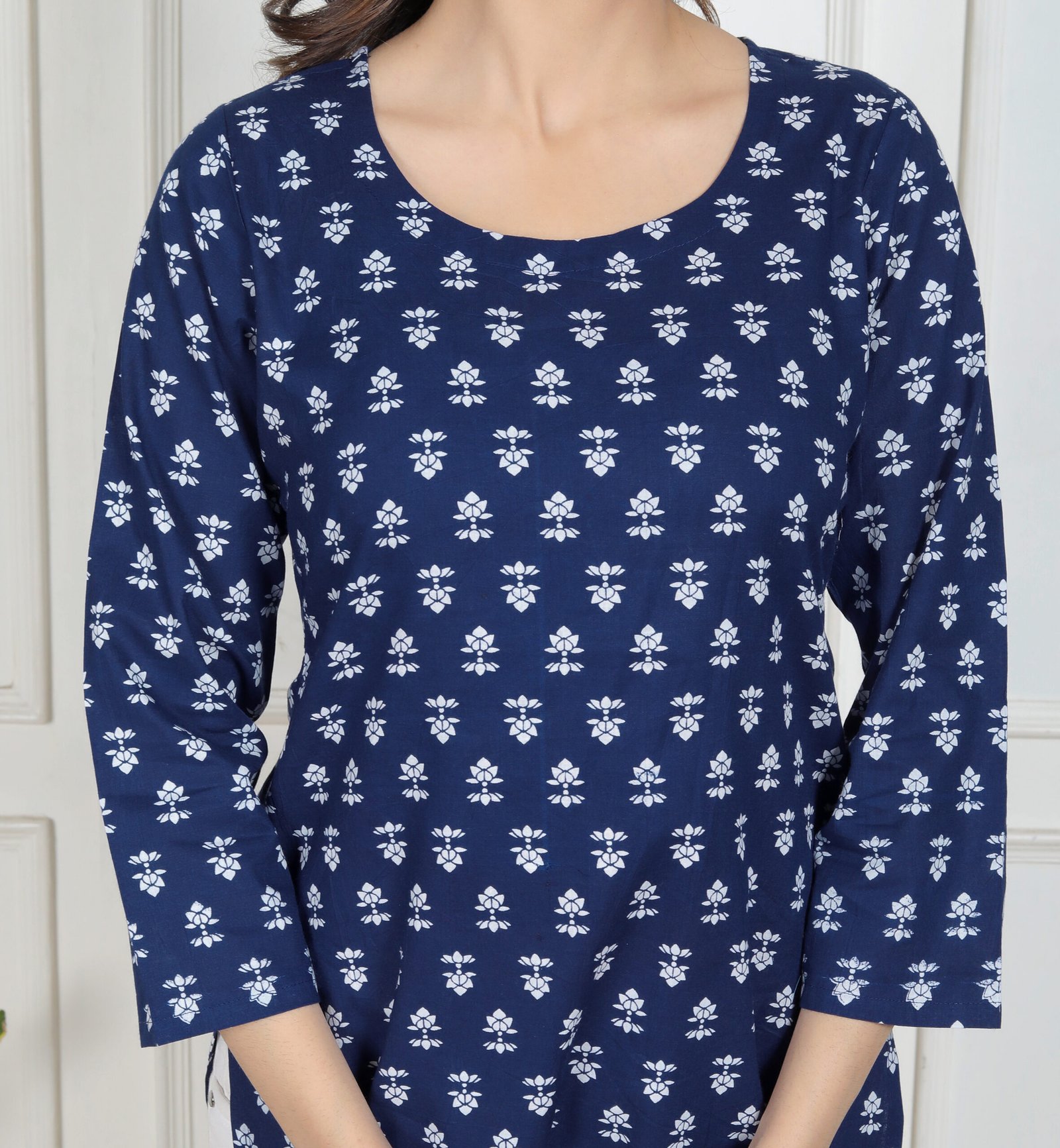 Nafeesa is designed for those who prefer simplicity with a refined edge. Set on a deep navy blue base, the kurti features evenly spaced white micro prints that create a clean, structured look — subtle yet visually appealing.