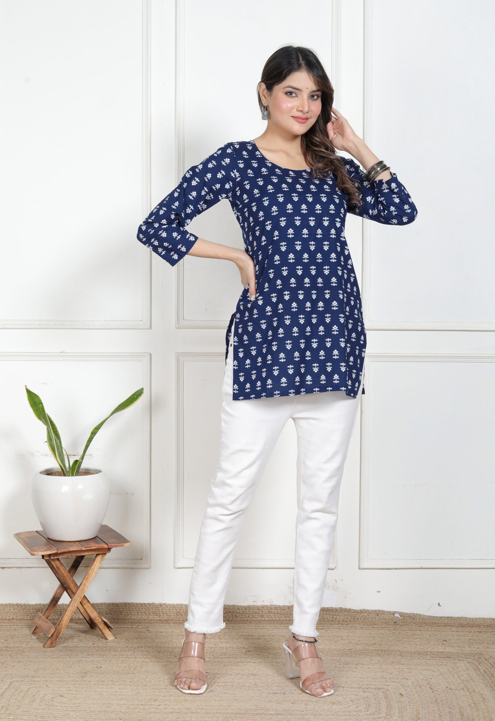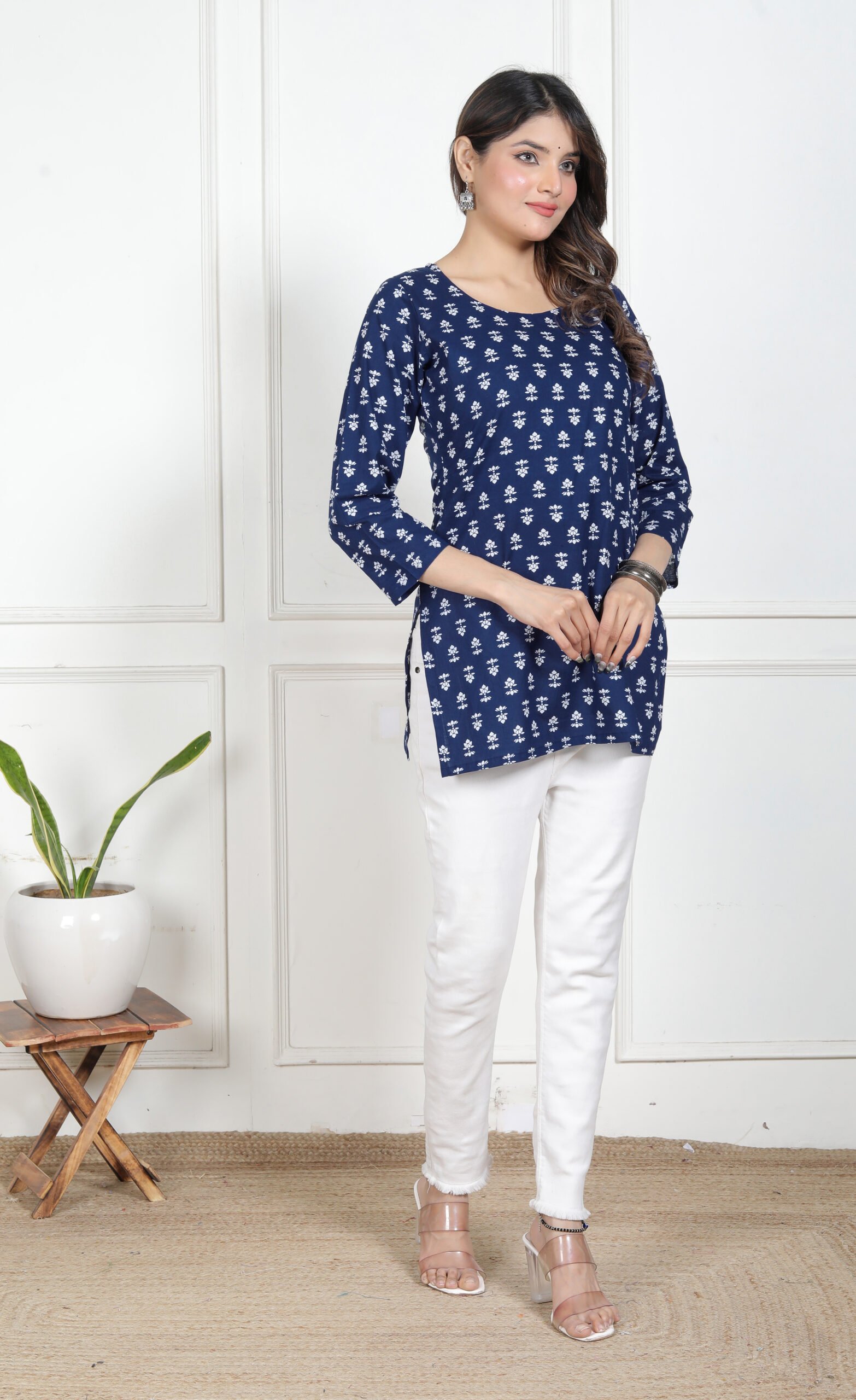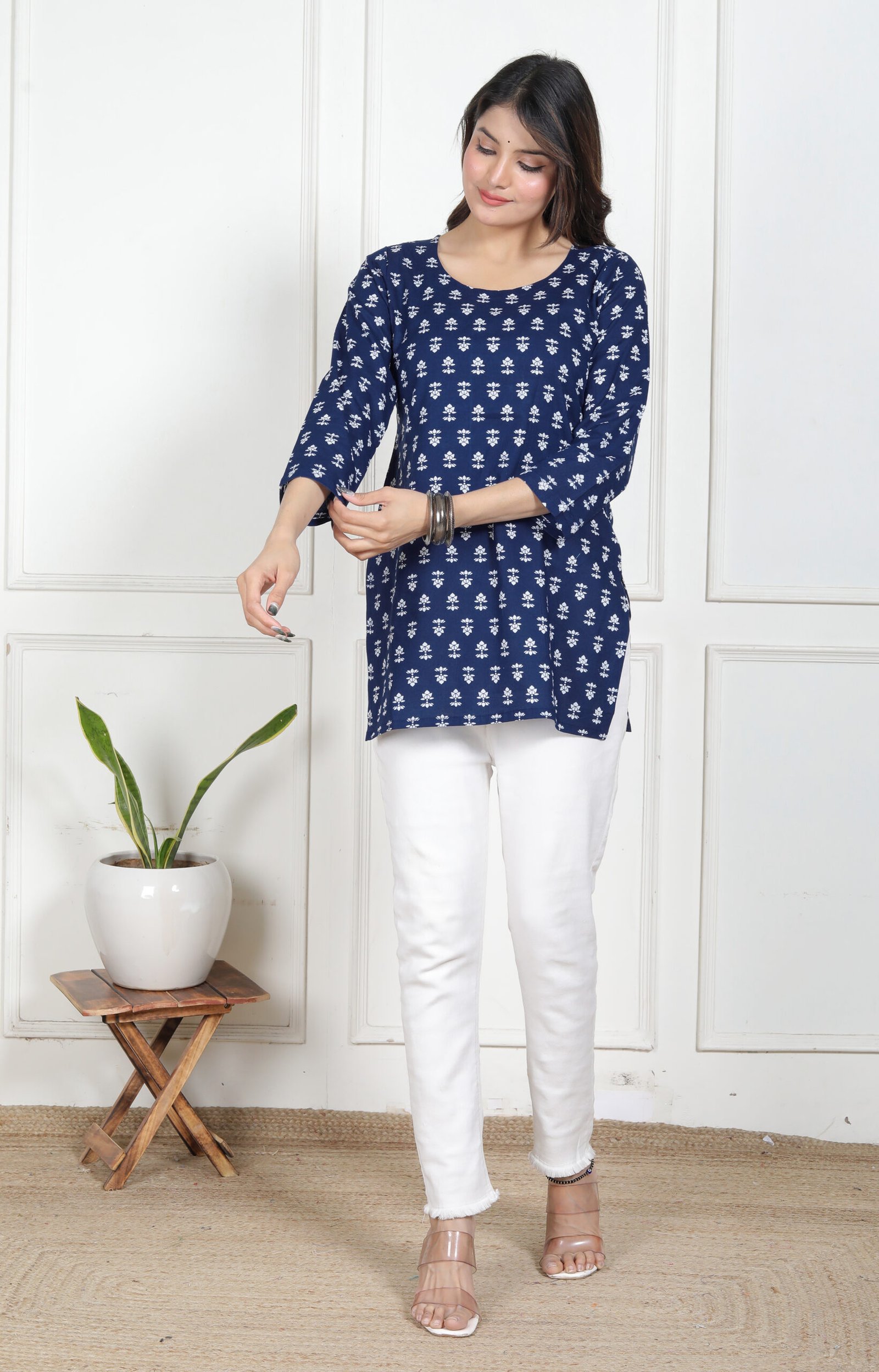 Nafeesa is designed for those who prefer simplicity with a refined edge. Set on a deep navy blue base, the kurti features evenly spaced white micro prints that create a clean, structured look — subtle yet visually appealing.