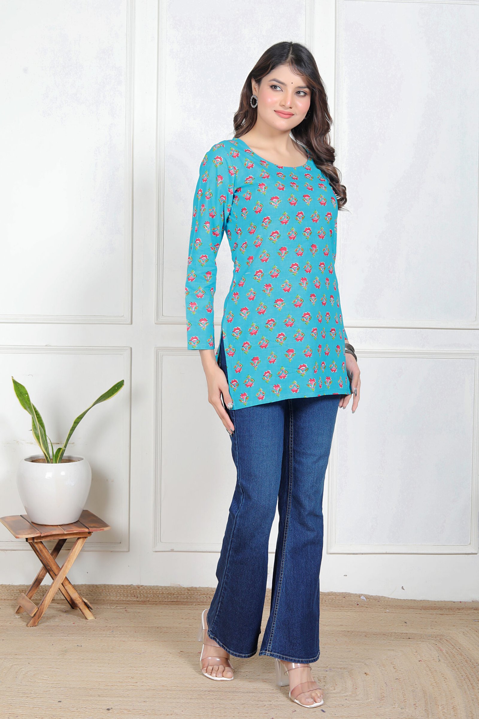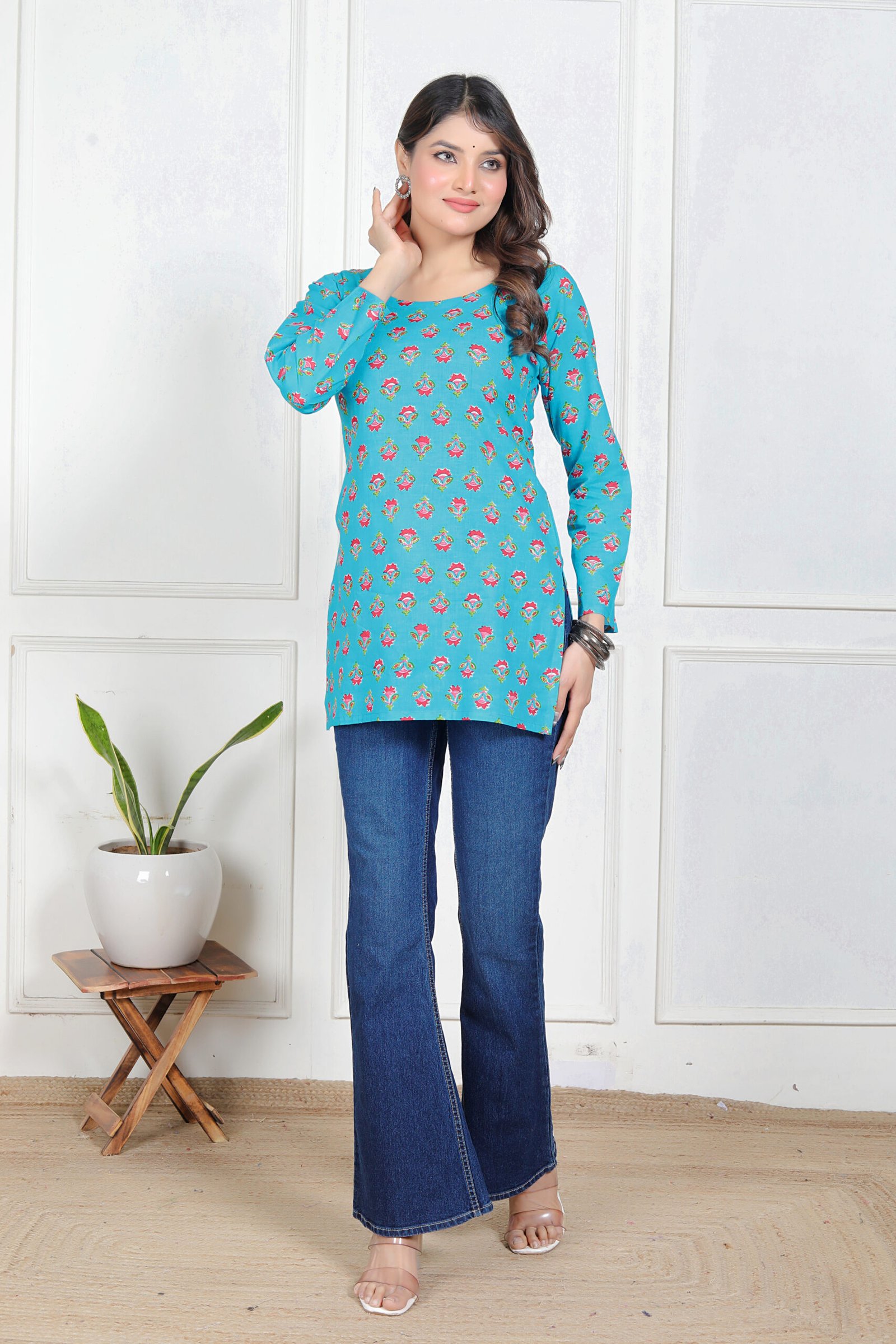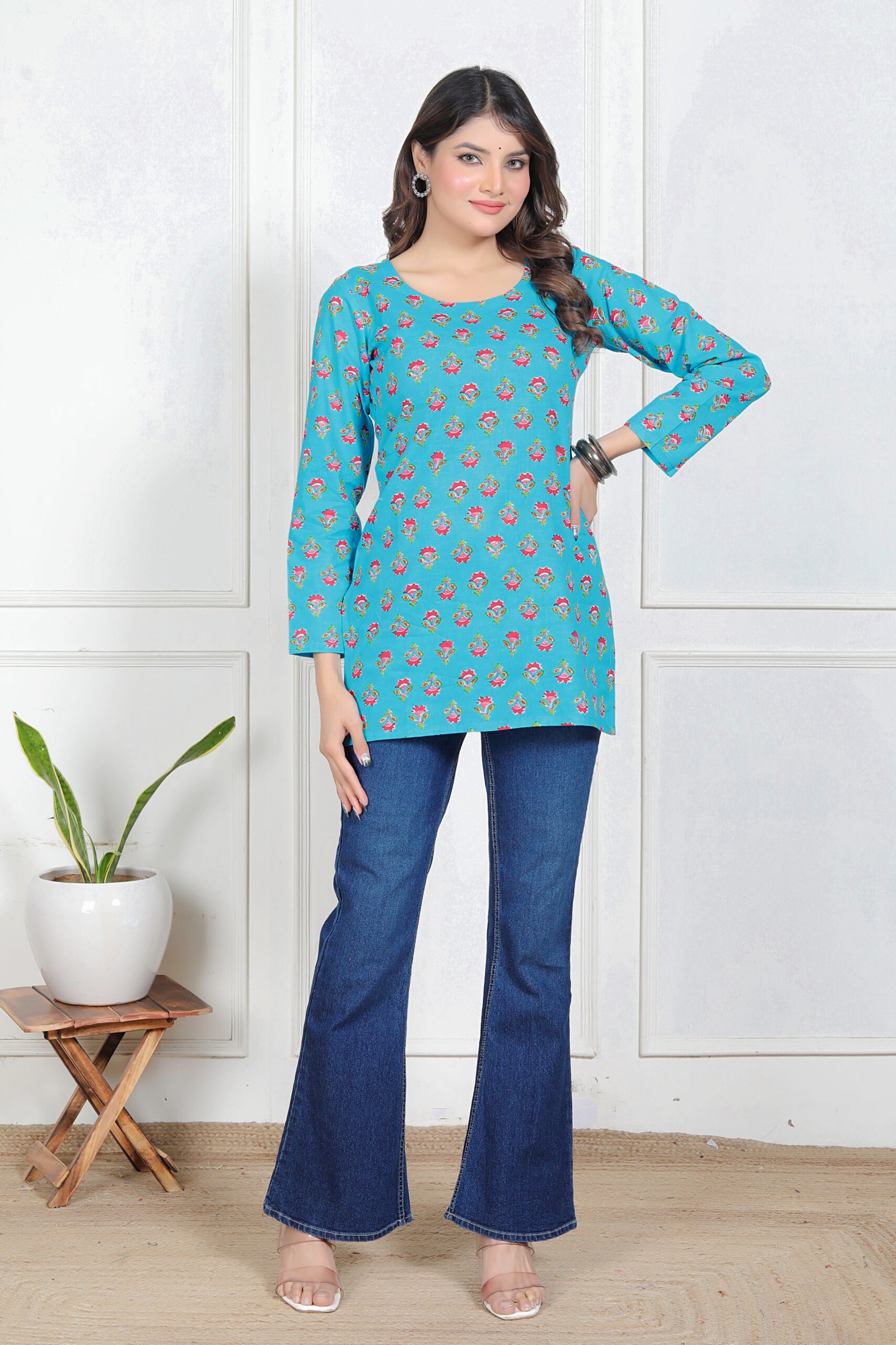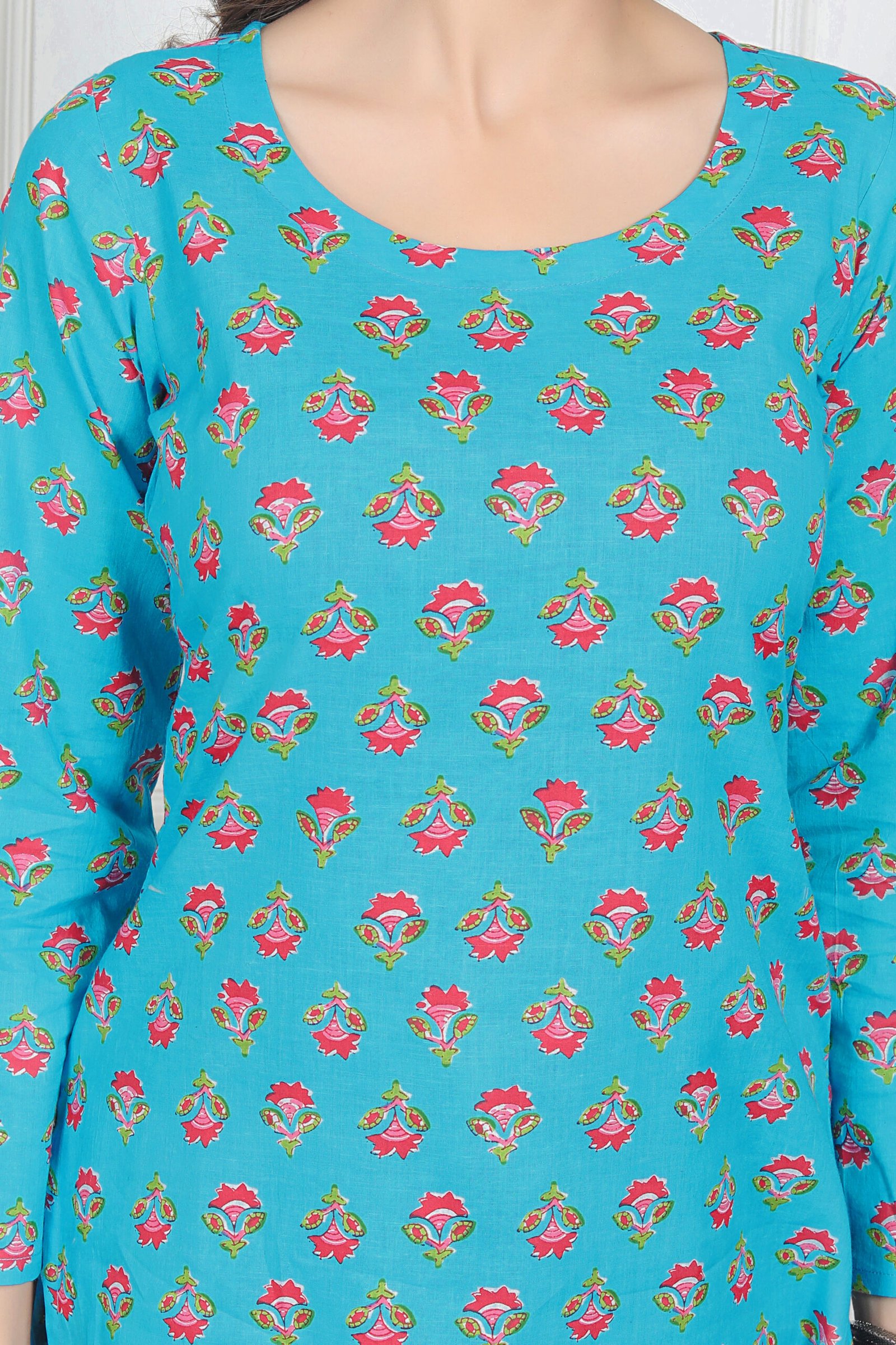 Ridaa Norani is a refreshing take on everyday elegance. Designed in a lively aqua blue base, the kurti features delicate pink floral motifs that add just the right amount of color and charm without overwhelming the overall look.