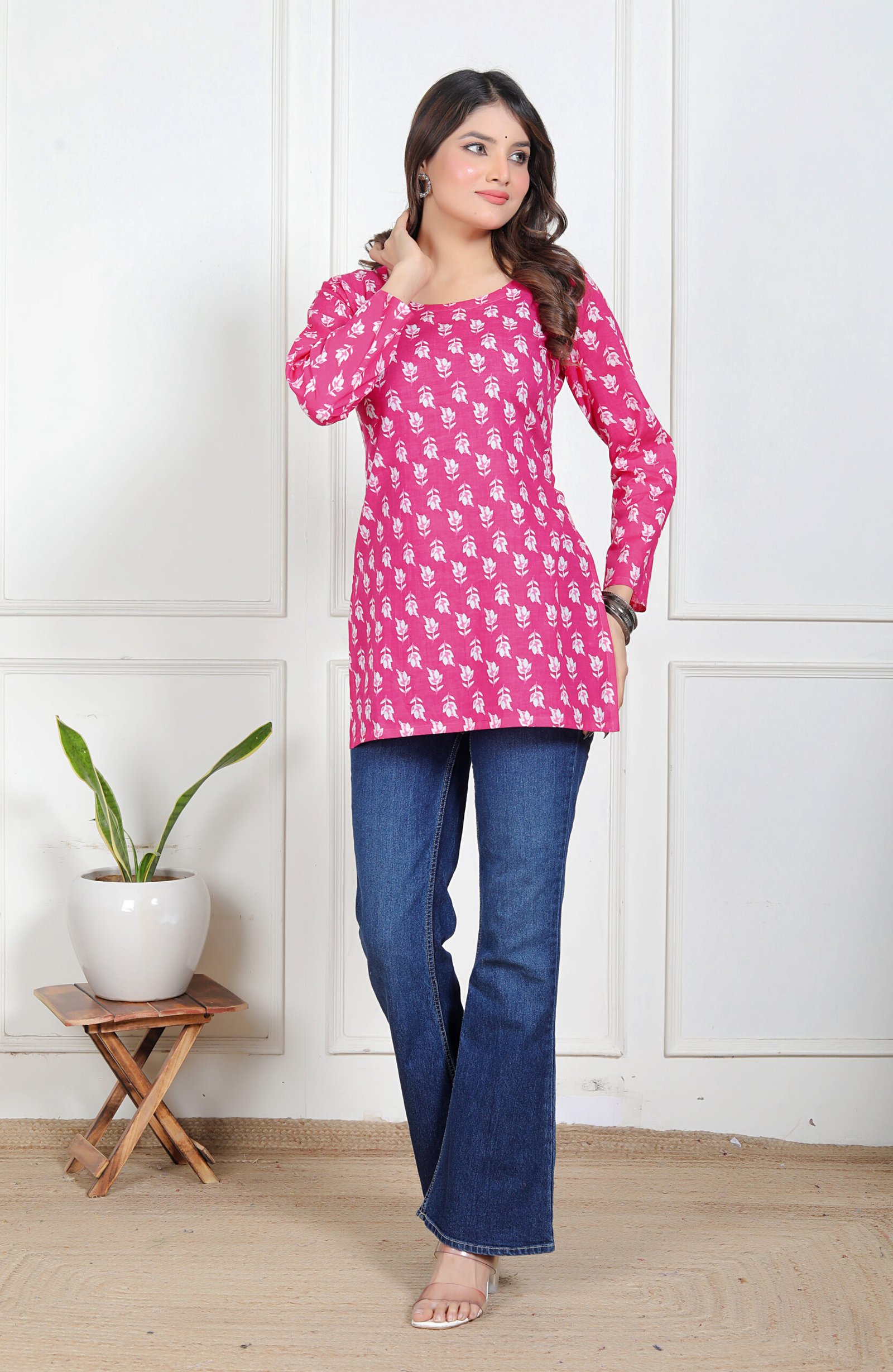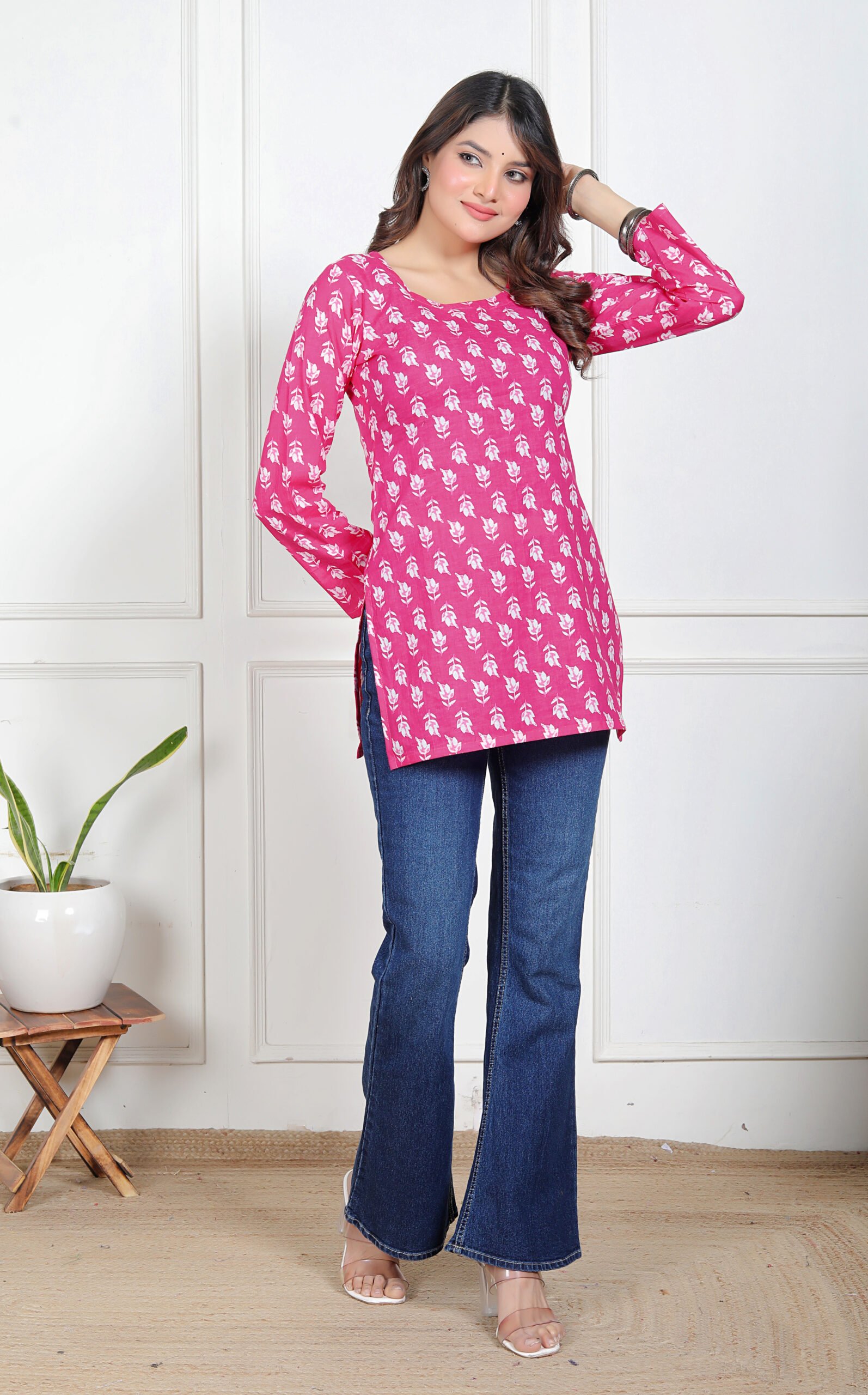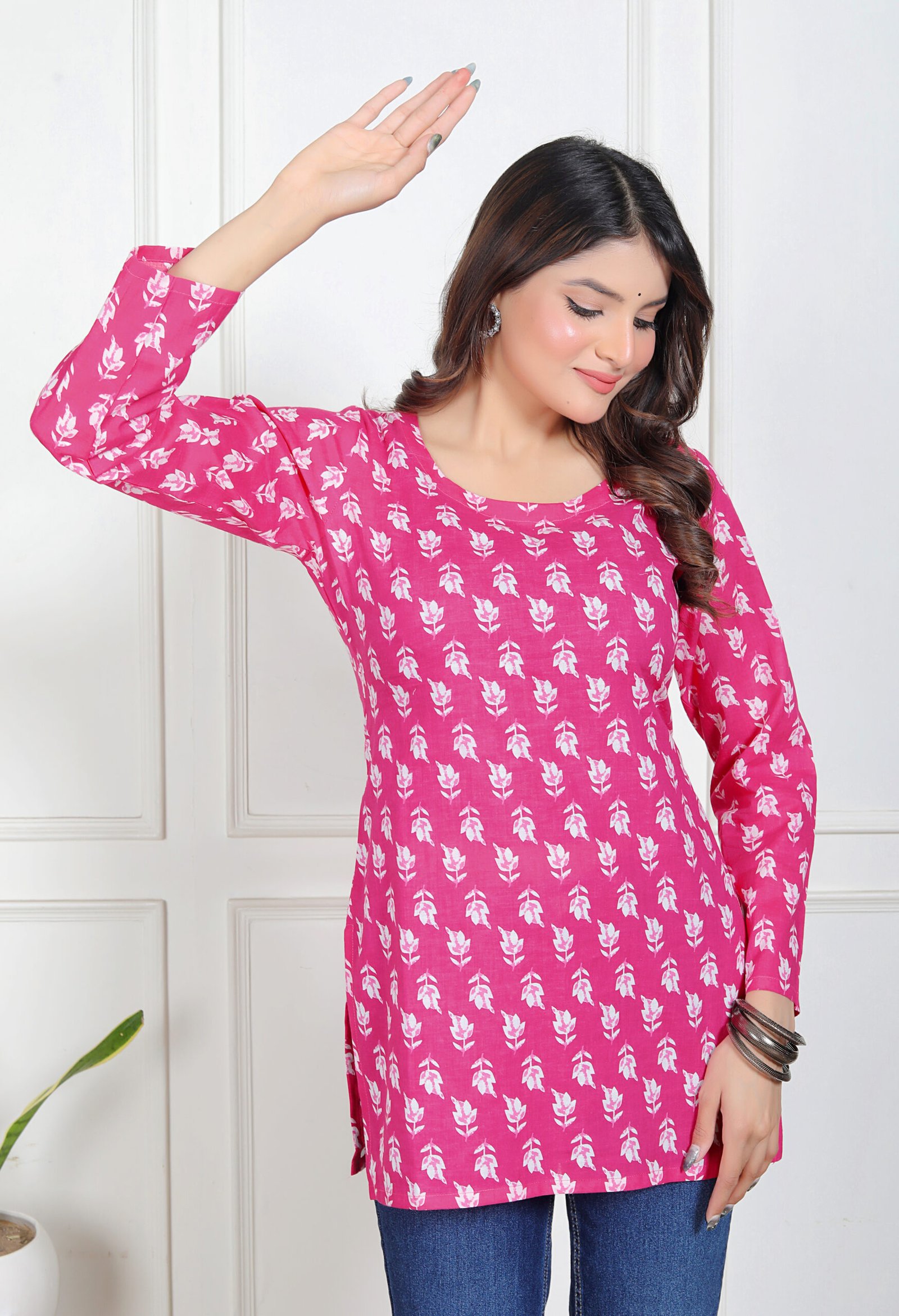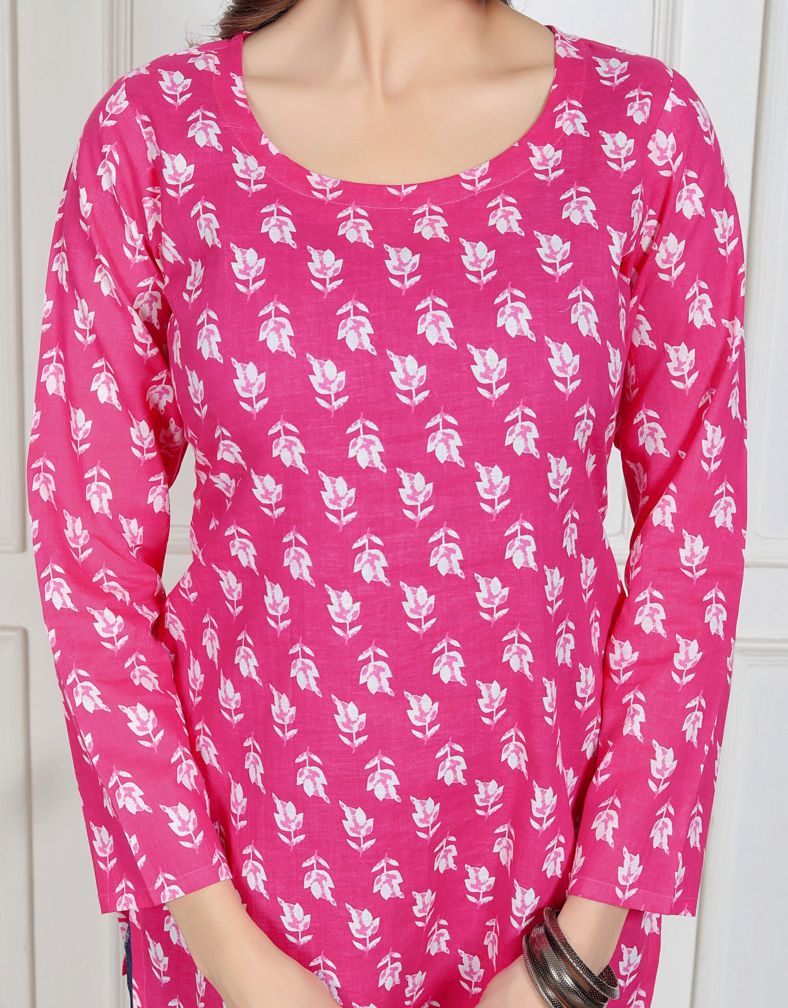 Ruqaiyya is all about keeping your style simple, fresh, and effortlessly put together. Designed in a lively pink base with delicate white leaf motifs, this kurti brings a soft, cheerful vibe that feels perfect for everyday wear.