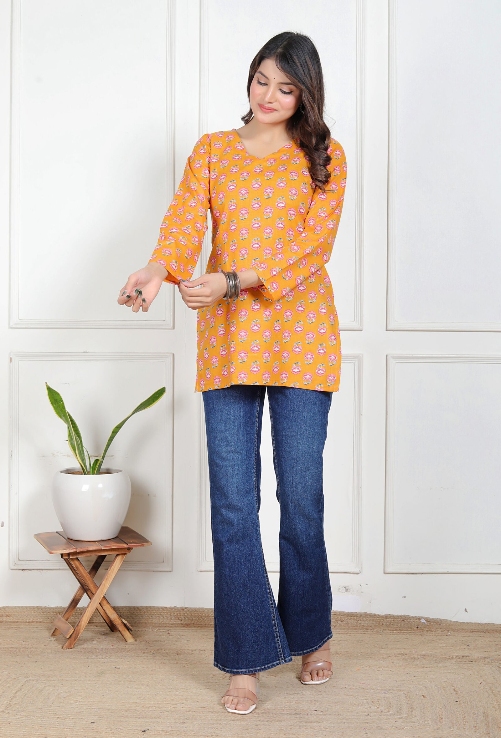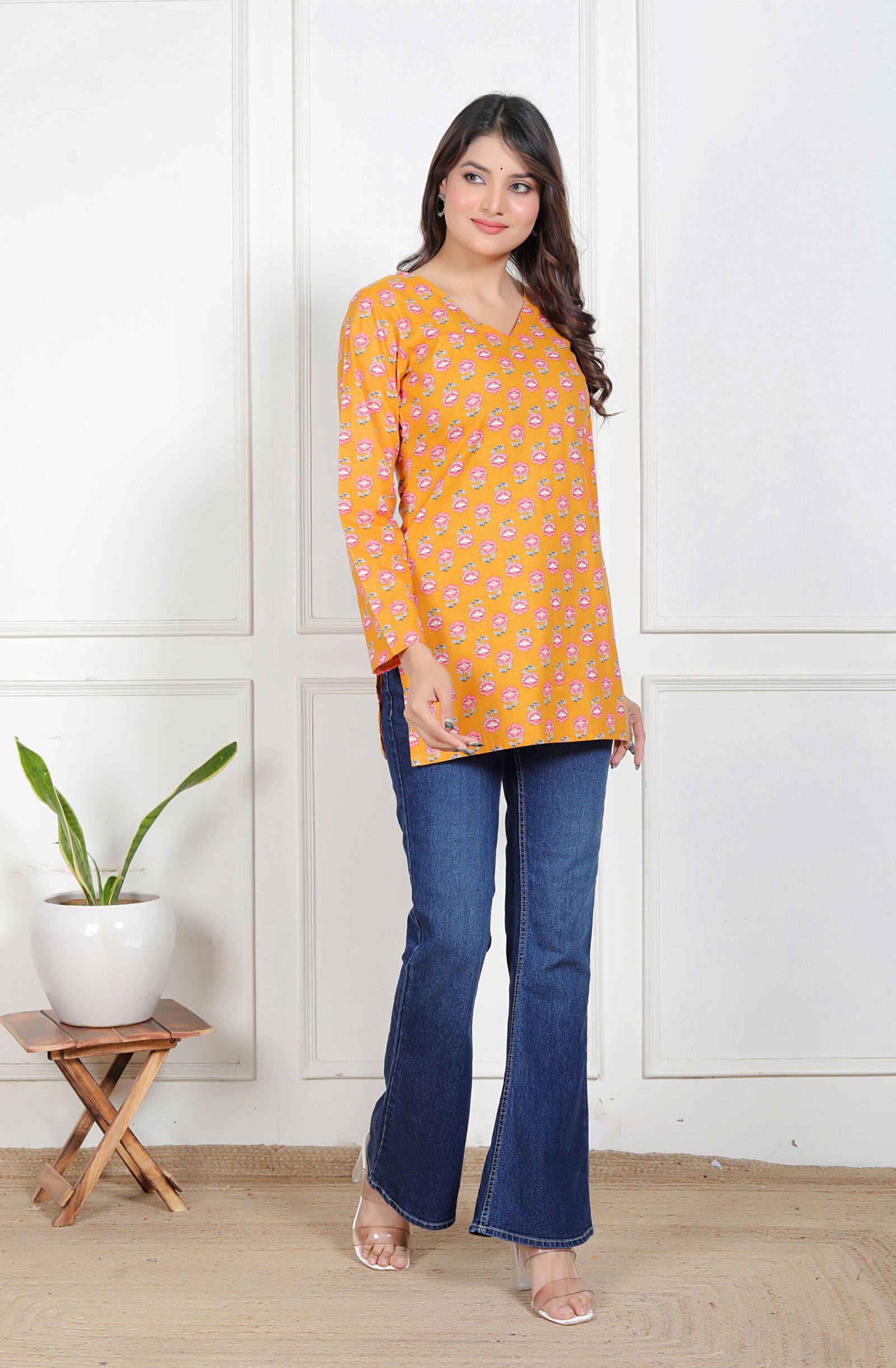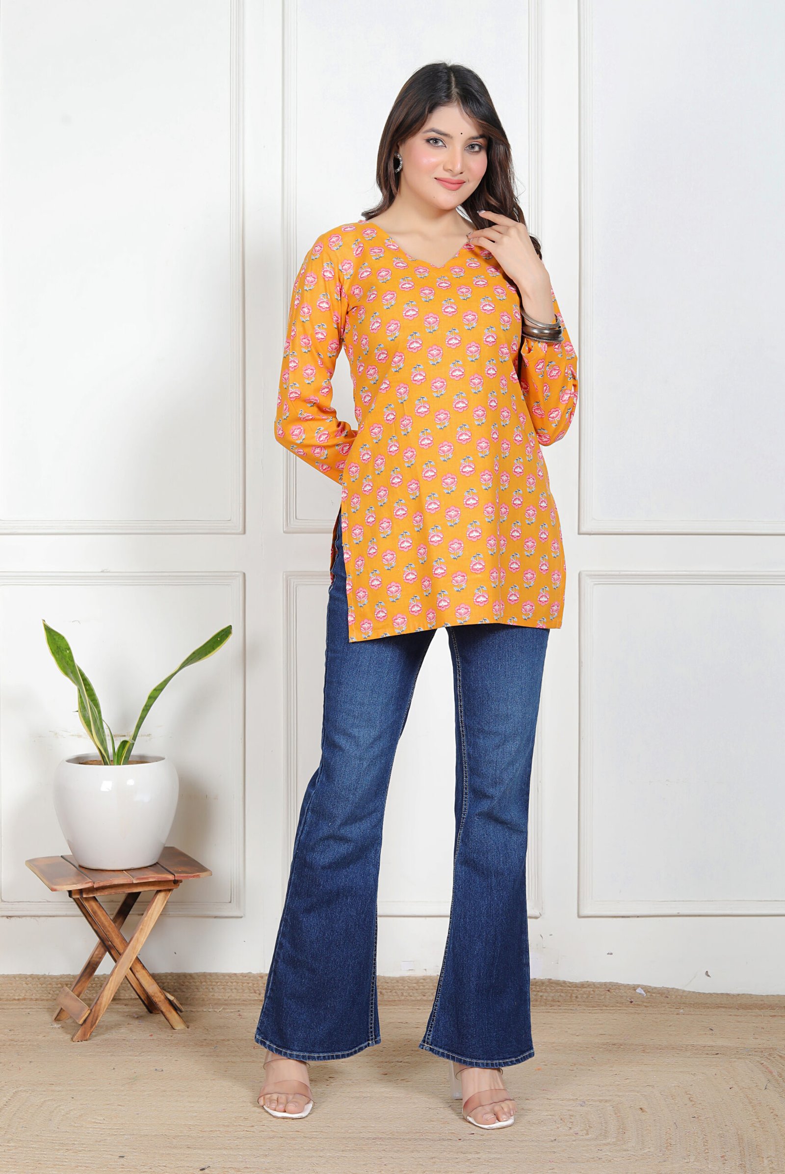 The clean straight sleeves and soft V-neckline give this kurti a neat, everyday-friendly appeal, making it easy to wear from morning to evening without any discomfort. Its lightweight cotton fabric keeps you cool, while the straight silhouette offers a smart and flattering fall.